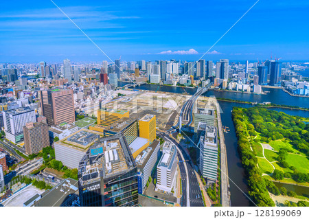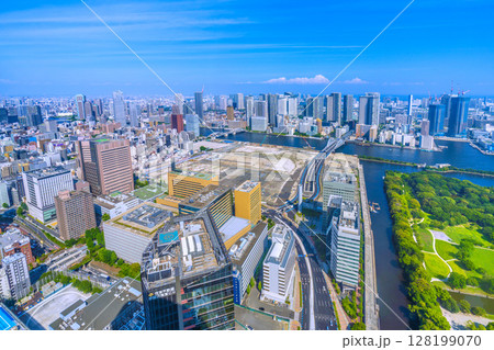 日本の東京都市景観 7月。新時代へ。築地市場跡地などを望む。再開発へ…=4日