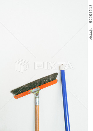 白い壁に立てかけられている自在ほうきとモップの柄の部分のクローズアップ - 掃除・家事のイメージ素材