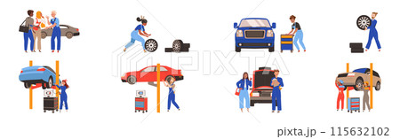 Car Repair Service with Mechanics Team in Garage Doing Technical Inspection and Automobile Diagnostics Vector Illustration Set