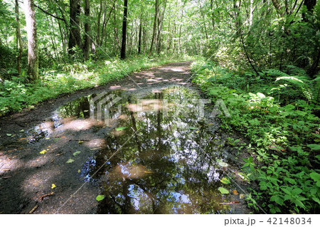 雨上がりの林道 水たまりと木漏れ日