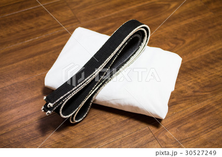 道場の床に置かれた道着(空手着、柔道着)と黒帯