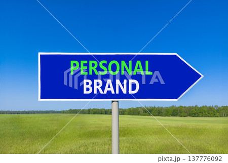 Personal brand symbol. Concept words Personal brand on beautiful blue road sign. Beautiful blue sky green grass field background. Business personal brand concept. Copy space.
