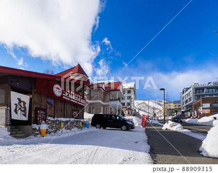 スキー場山麓に並ぶスキー用品店 (北海道、俱知安、ひらふ坂)