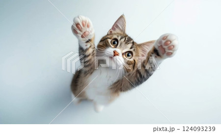 A playful tabby kitten is captured from above, reaching up with its paws outstretched. The kitten's wide eyes are full of curiosity and excitement, gazing directly at the camera.