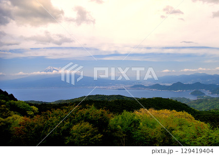 静岡 夕暮れ時の富士山と駿河湾 達磨山からの風景