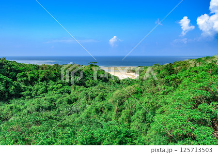 高台のホテルから眺める木や自然越しの海と爽快な青空、南国リゾートの風景(沖縄県宮古島市)