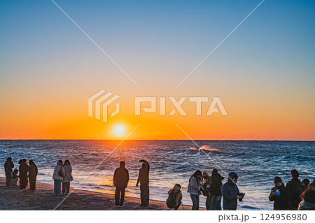磐田市にある福田海岸から見た初日の出を見る人々の風景(静岡県)