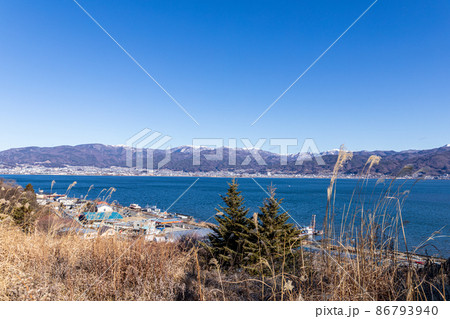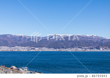 「長野県」諏訪湖越しに見える遠方の雪山
