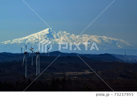風力発電と雪を被った鳥海山