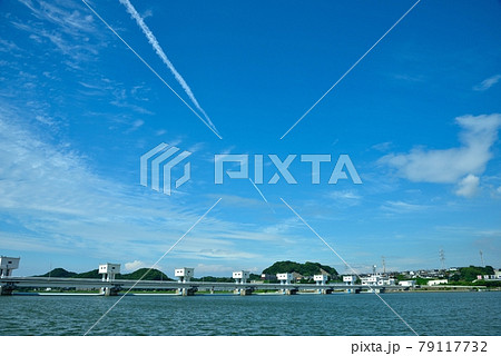 遠賀川河口の水門と飛行機雲の風景