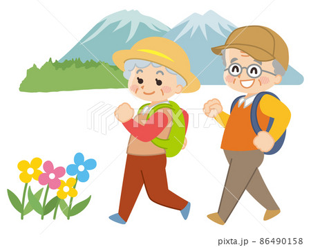 ハイキングをするシニア夫婦 散歩 ウォーキング