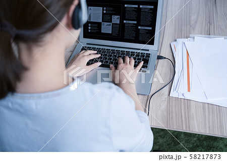 Back view of young woman working at laptop and wearing headphones. Freelance and online education. Remote video consultation with psychotherapist