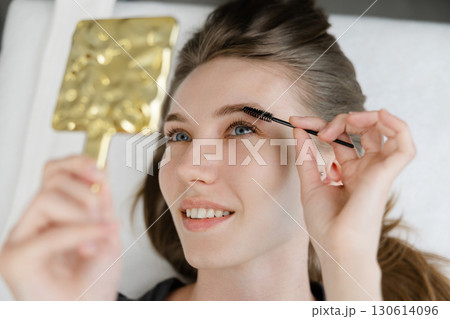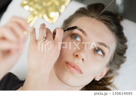 Beautician combing eyebrows of client after lamination treatment