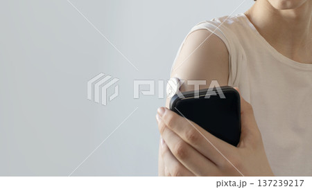 Close-up of young person using smartphone to scan continuous glucose monitor CGM sensor