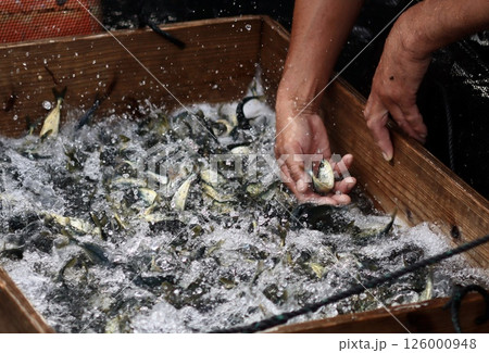 水槽で鮮魚を手に取る水産業の作業風景