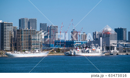 日本の東京都市景観 豊海地区のタワーマンションや晴海、照洋丸などを望む。左奥に日本橋再開発