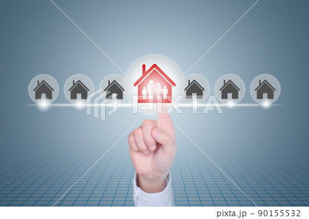 商務人士手指點擊虛擬屏幕上的房子圖標,人物置業概念創意圖