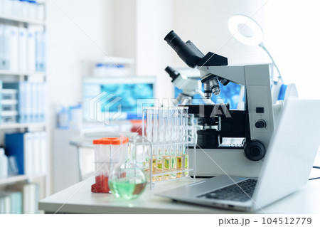 研究室で研究開発をするための実験器具と顕微鏡