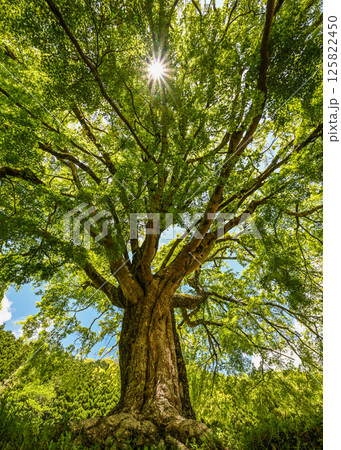 新緑の季節の樹齢150年のイロハモミジを見上げる