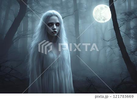 森の中に立っている白いドレスを着た美しい女性のイラスト