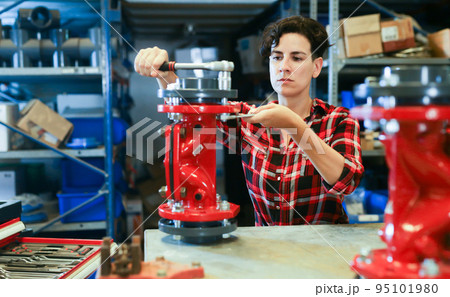 Woman assembling plumbing fixture in workshop
