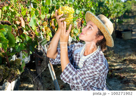 Young woman eating ripe grape in farm and smiling