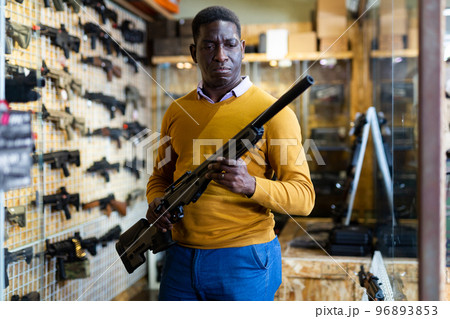 Portrait of african american man choice pneumatic gun in airsoft market