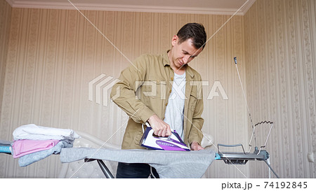 Concentrated man wearing brown shirt does chores and irons
