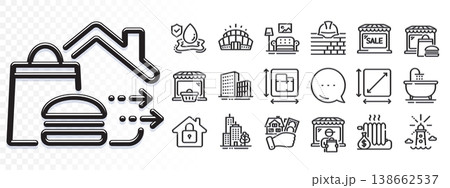 Lighthouse, Square area and Bath line icons set for app include Delivery market, Food market, Buildings outline thin icon. Flood insurance, Buying house, Food delivery pictogram icon. Vector