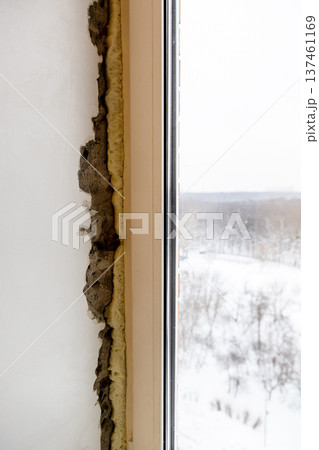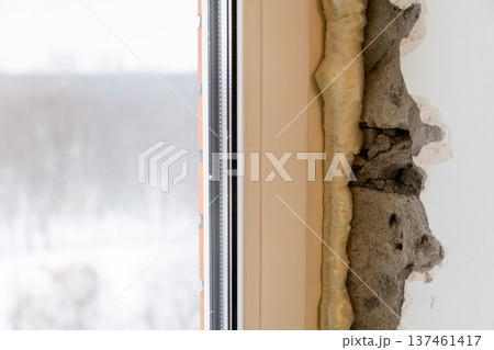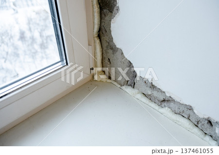broken concrete sill filled with construction foam