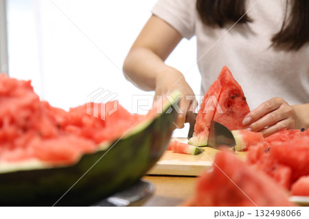 スイカ割りで割ったスイカを切り分ける女性