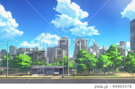 都会のビルとかわいい街並みのシンプルでモダンな背景イラスト
