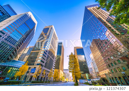 日本の東京都市景観 年の瀬。大手町の摩天楼。低い太陽光が柔らかな光でオフィスビル群を包み込む=22日