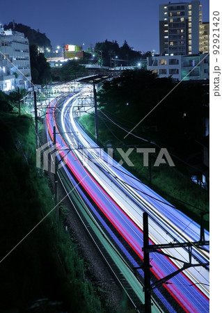 東急田園都市線の光の軌跡とブルーアワーの夜景