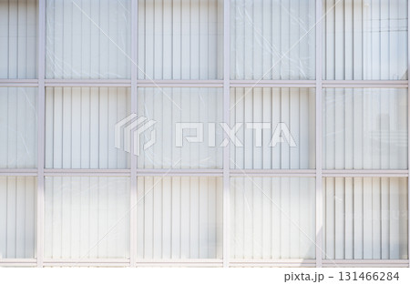 白いブラインドが並ぶ建物の外観と整ったガラス窓(ミニマル・幾何学模様)