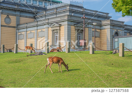 奈良国立博物館前で草を食べる鹿の群れ
