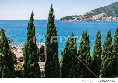 Tall cypress trees framing coastal city and blue sea view. Mediterranean Montenegro landscape balance, natural greenery, urban seaside living and calm summer atmosphere with harmony between