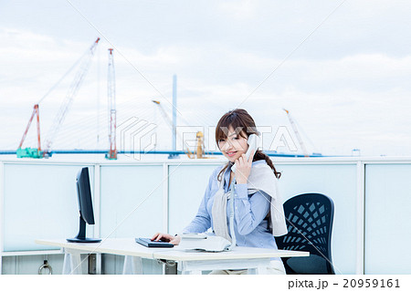 電話をとるビジネス女性 カジュアル 青空オフィス