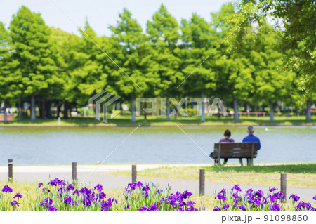 初夏の公園 綺麗に咲く花菖蒲の風景
