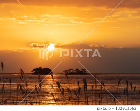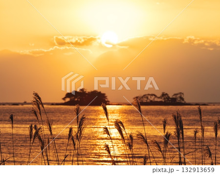 晩秋の朝焼けに染まる富山湾と虻ガ島をススキ越しに臨む