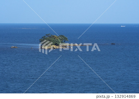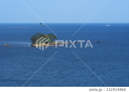 秋空の九殿浜園地から富山湾に浮かぶ虻ガ島を臨む