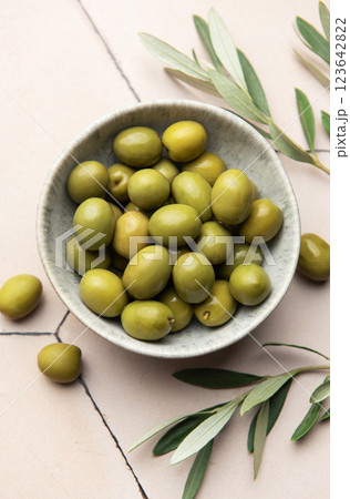Green olives with olive branches resting in a bowl on a tiled surface