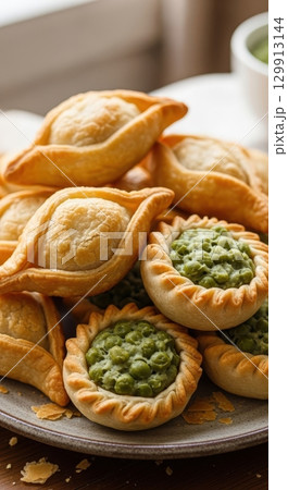 Traditional maltese pastizzi pastries with ricotta and mushy pea filling on a rustic plate