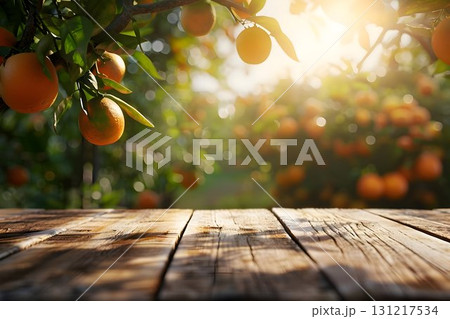 empty wooden, blurred background garden in the morning, summer