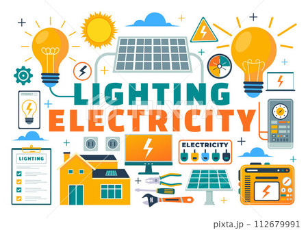 Lighting and Electricity Vector Illustration with Lamp and Energy Maintenance Service Panel Cabinet of Technician Electrical Work on Flat Background