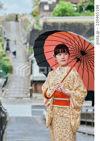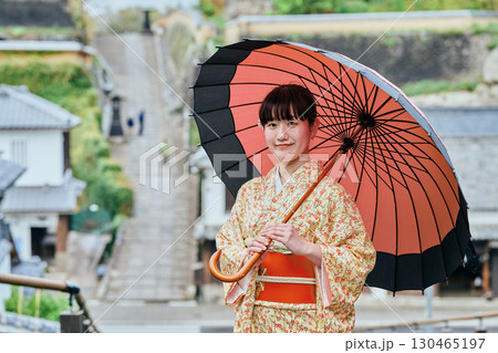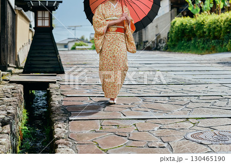 城下町を散策する着物姿の女性