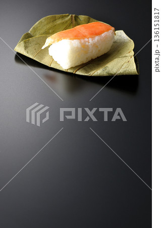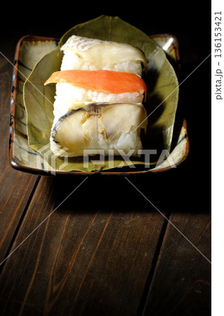 鮭と鯛と鯖の柿の葉寿司を黒背景で撮影