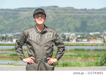青空の下にいるつなぎ姿の作業員・整備士の男性