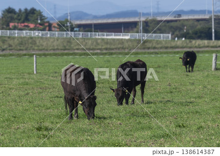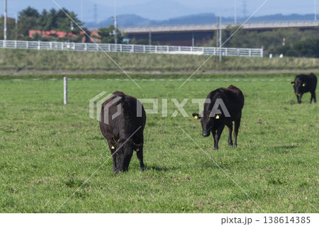 牧草地で放牧する黒毛牛