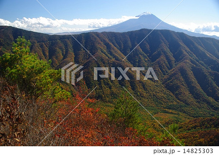 御坂山地の釈迦ヶ岳山頂より望む富士山と御坂山地